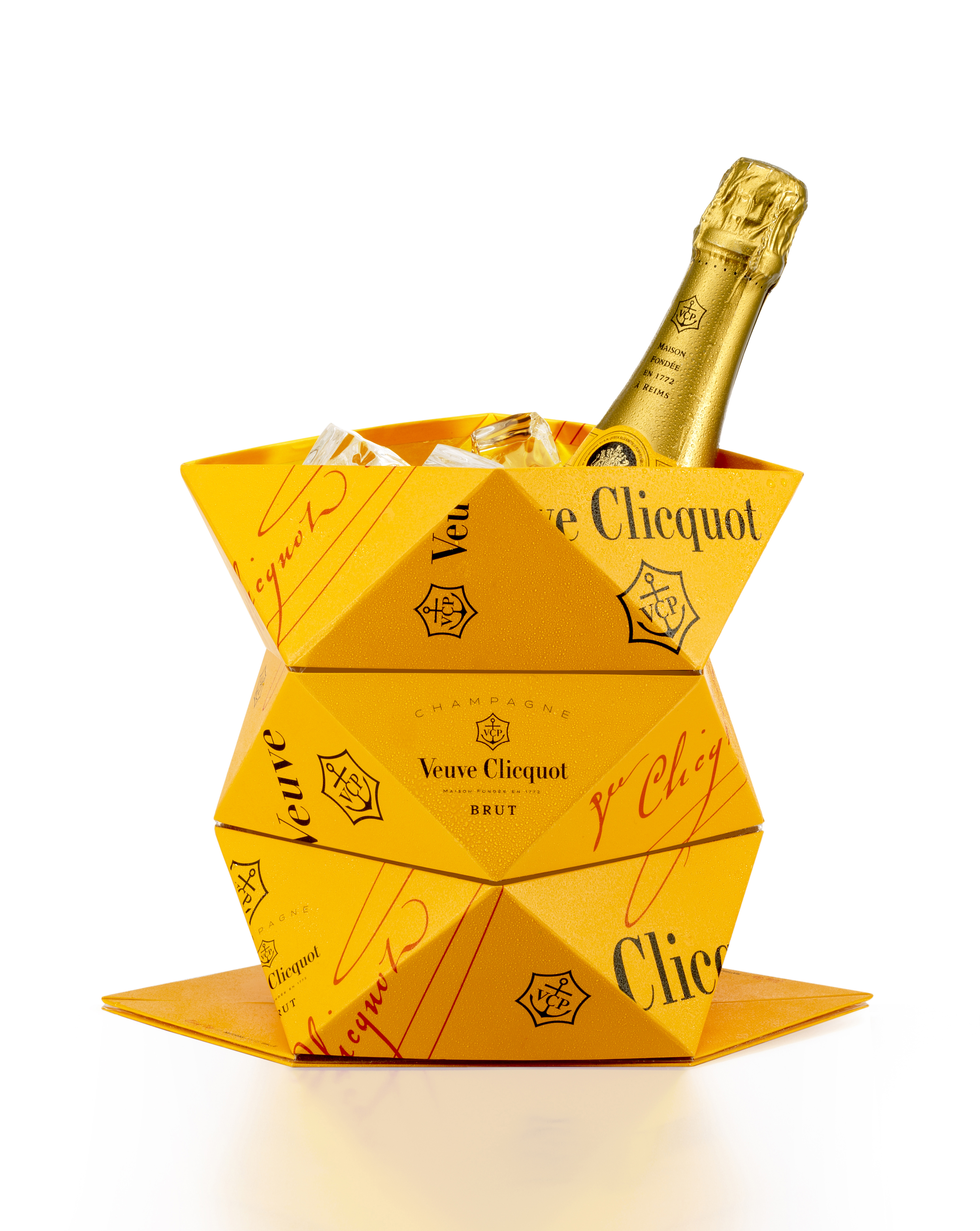 Non è sicuramente da meno la confezione-regalo Veuve Clicquot Yellow Clicq’Up, che accompagna le bottiglie da 750 ml dell’omonimo champagne. Elegante a tal punto da rendere pleonastico l’uso di carte-regalo e ulteriori orpelli, la scatola dall’inconfondibile colore giallo intenso che identifica immediatamente i prodotti della nobile maison d’oltralpe è dotata di un vano che cela una sorpresa tanto originale quanto utile: un origami dall’aspetto di un foglio, che con un paio di semplici mosse si trasforma in un vero e proprio secchiello da champagne, riutilizzabile almeno 3-4 volte. Il merito di questa piccola magia di nome Clicq’Up spetta al talento progettuale del designer belga Mathias van de Walle.