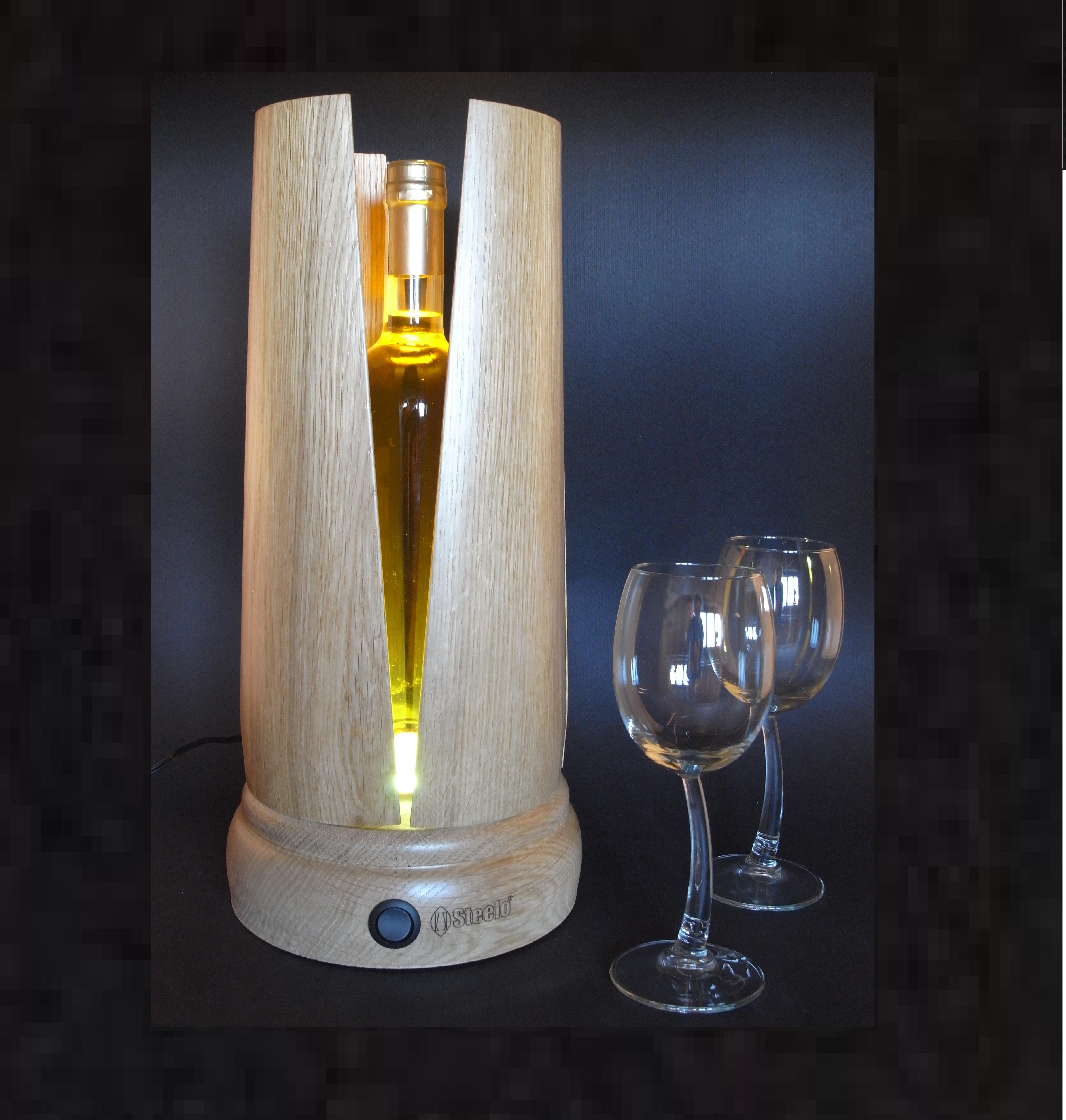 Pure in Steelo, confezione-regalo per vini a marchio Wood & Mood, la dialettica contenuto-contenitore e l’emancipazione di quest’ultimo dal primo (un po’ come la dialettica servo-padrone di hegeliana memoria) conduce a risultati virtuosistici. Dopo che le pregiate pareti in legno di Steelo si sono aperte come i petali di un fiore svelando la bottiglia, è sufficiente estrarre quest’ultima perché la confezione si trasformi in un’esclusiva lampada da tavolo, dotata di un luminoso faretto interno.