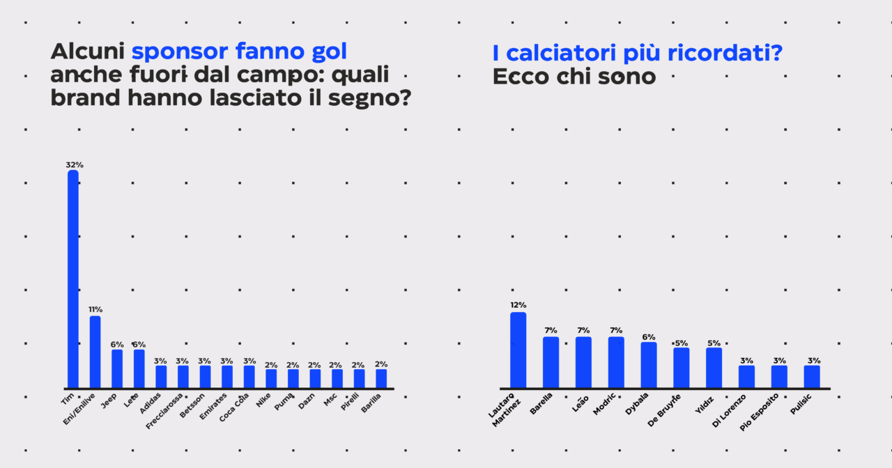 L’indagine conferma che il calcio continua a essere il terreno privilegiato per la costruzione di identità e riconoscibilità. Sul podio dei brand più ricordati, Tim mantiene la leadership con il 32% delle citazioni, seguita da Eni/Enilive (11%), attuale title partner della Lega Serie A, e Jeep (6%). A seguire, un mosaico di marchi che vanno da Lete e Adidas (6% e 3%) a Frecciarossa, Bettson, Emirates, Coca-Cola, Nike, Puma, Dazn, Msc, Pirelli e Barilla, tutti oscillanti tra il 2% e il 3%.