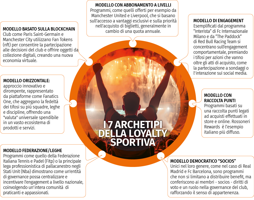 In questo contesto, il tifoso si evolve da semplice consumatore a vero e proprio ambasciatore del marchio inserendosi in una community più coinvolta e incentivata attraverso un modello ibrido che unisce la passione per la squadra con i benefici di un programma di loyalty. Il rapporto di fedeltà tifoso-club è diventato senza dubbio oggi un asset di business strutturato e monetizzabile. Le strategie di fidelizzazione nel mondo dello sport hanno sviluppato diversi modelli che, pur differenziandosi per approccio e tecnologia, condividono l’obiettivo comune di rafforzare il legame con i tifosi. È possibile individuarne sette, che rappresentano l’evoluzione e la diversificazione di queste iniziative.