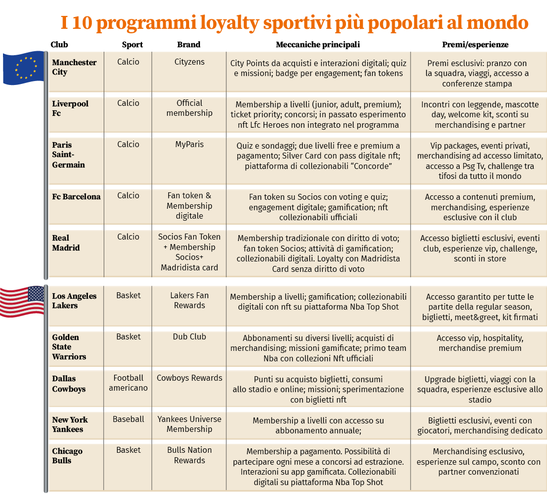 Un recentissimo esempio di questo modello è dato dal programma “Interista” di Fc Internazionale Milano concepito come una piattaforma per valorizzare ogni forma di partecipazione dei tifosi e per costruire nuove forme di sponsorship. Il programma gratuito offre l’opportunità di accumulare punti, per accedere agli 11 diversi livelli dello schema, e di raccogliere “monete nerazzurre” per l’accesso a un catalogo di rewards che spazia da sconti sul merchandising, benefit esclusivi, ed esperienze uniche, come incontri con i giocatori, tour personalizzati di San Siro e la possibilità di assistere ad allenamenti a porte chiuse. L’obiettivo strategico non è solo incentivare le vendite, ma anche premiare la partecipazione a giochi, concorsi e quiz e anche di stimolare l’interazione con i canali digitali del club trasformando così la passione in un engagement continuo e misurabile. Premiando le interazioni digitali, con il contributo di strategie data-driven e di gamification il club raccoglie preziosi dati proprietari sul comportamento dei tifosi, un asset strategico per un marketing più mirato e partnership commerciali più vantaggiose. Sul programma leggi l’intervista a Roberto Monzani, Inter media house director pubblicata sul numero 4 di Promotion.