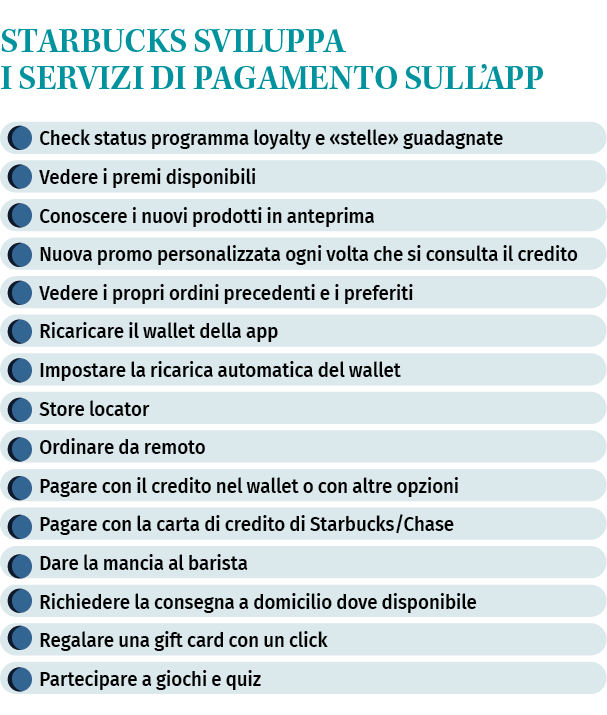 Un caso eccellente di sviluppo di servizi e di valore per il cliente tramite app è rappresentato da Starbucks. Accanto ai classici servizi legati al programma di fidelizzazione, come il check del proprio status nel programma loyalty, delle “stelle” guadagnate, dei premi disponibili; oltre alle informazioni sul punto di vendita (locator e orari), sulle novità (come conoscere i nuovi prodotti in anteprima), e sullo storico dei propri ordini e la lista dei prodotti preferiti, Starbucks ha introdotto un wallet, che l’utente ricarica di credito spendibile poi per le seguenti attività: pagare in negozio o al drive-through; pagare online e richiedere la delivery; ordinare da remoto e pagare passando direttamente a ritirare il prodotto senza fare la coda; ricaricare il wallet stesso in automatico; dare la mancia al barista; comperare una gift card o regalarla a qualcuno con un click, pagandola con il credito del wallet; ricevere un’offerta personalizzata diversa ogni volta che si consulta il credito del wallet. Questi servizi, come possiamo comprendere, modificano l’esperienza del cliente in diverse fasi della sua journey, contribuendo a fornirgli comodità e catturando nuove occasioni di acquisto, oltre che generando revenue per Starbucks grazie ai depositi che si accumulano nel wallet stesso, che sono stimati in 1,87 miliardi di dollari nel 2024.