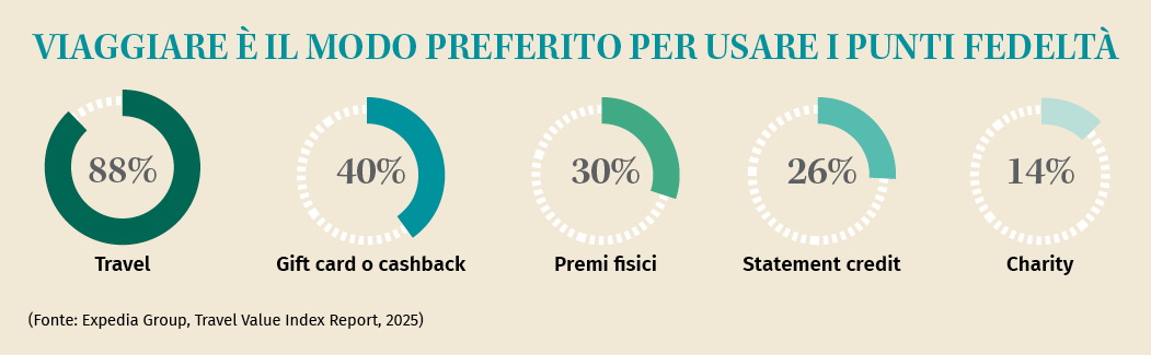 Uno studio commissionato da Expedia quest’anno su 11 paesi (Travel Value Index Report 2025), inclusa l’Italia, ha mostrato che redimere i punti dei programmi fedeltà per ottenere viaggi e vacanze è l’opzione di gran lunga preferita dai consumatori (83%), seguita a grande distanza dall’ottenere gift card (40%), e inoltre l’83% dei consumatori è interessato a prenotare viaggi e vacanze tramite un programma fedeltà di un settore diverso dai viaggi, che offra tale possibilità. Il 43% è addirittura “molto interessato”.