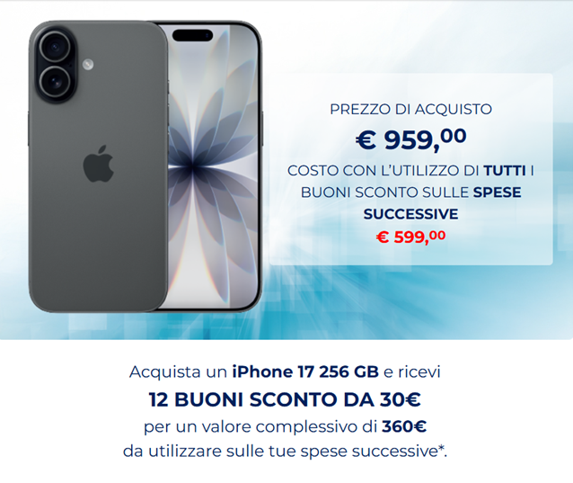 L’offerta esclusiva per l’acquisto dell’Iphone 17 introduce una meccanica pensata per rafforzare traffico e conversione nei punti vendita Esselunga. L’iniziativa si rivolge ai clienti titolari di carta Fìdaty e prevede che dall’1 al 14 dicembre 2025, acquistando in negozio l’Iphone 17 256 GB al prezzo di 959 euro, si ricevano 12 buoni sconto da 30 euro ciascuno, per un valore complessivo pari a 360 euro.