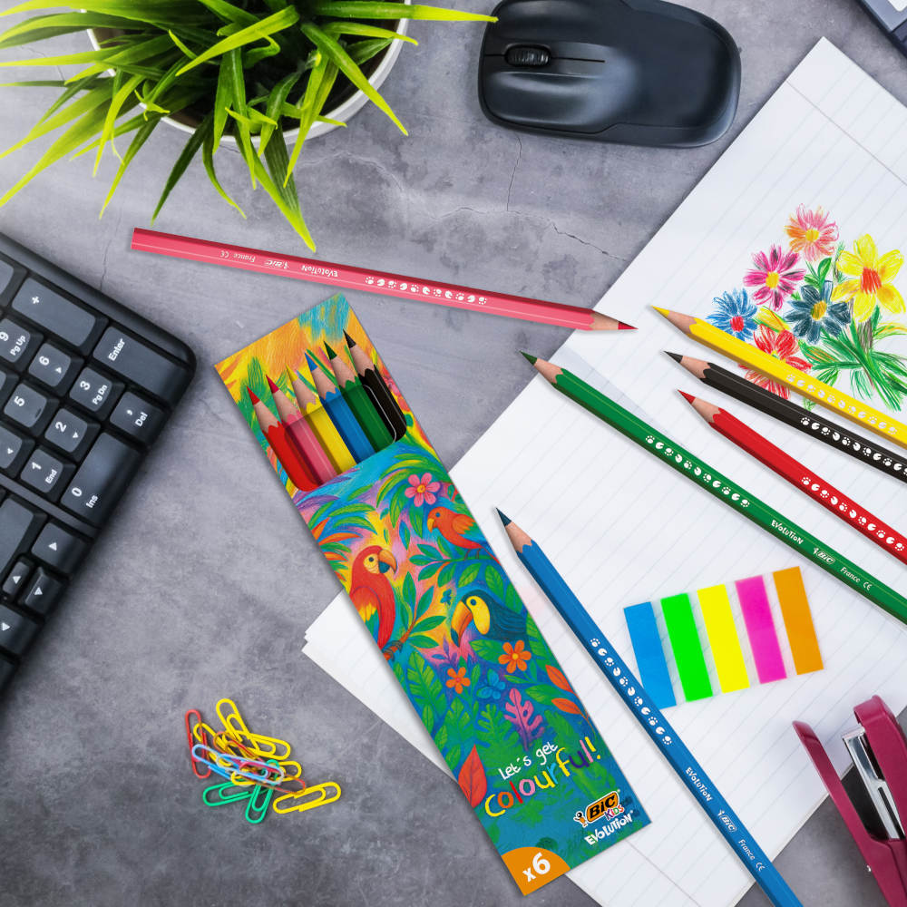 Il BIC® Kids Evolution® Colouring Set unisce creatività e rispetto per l’ambiente. Ogni confezione contiene 6 o 12 matite colorate ultra resistenti, senza legno e realizzate al 51% con materiali riciclati – provenienti da vecchi frigoriferi e vasetti di yogurt, senza abbattere un solo albero.