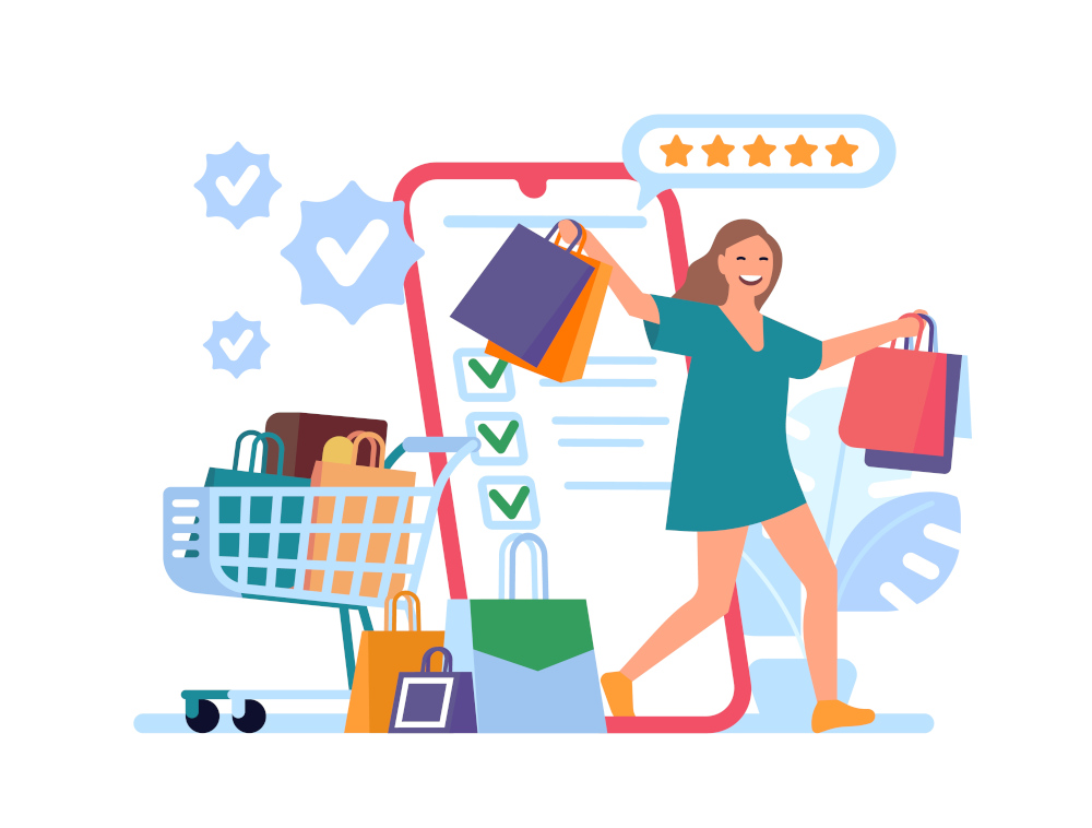 Woman shopping online. Mobile application. Person buying clothes over phone. Smartphone screen. Customer making purchases. Rating stars. Happy buyer with store bags. Internet shop app. Vector concept
