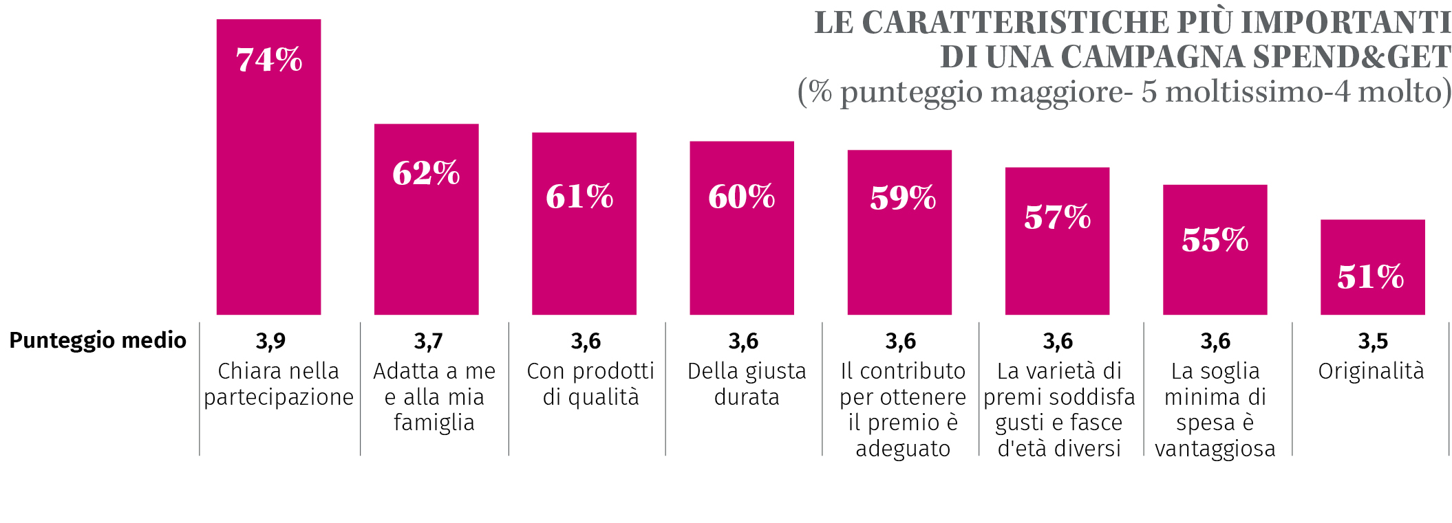 Dal punto di vista delle caratteristiche ideali della campagna, i consumatori premiano soprattutto la chiarezza della meccanica di partecipazione (74% di valutazioni alte, con punteggio medio di 3,9, su in una scala da 1 a 5), il gradimento rispetto ai bisogni della famiglia (62%) e la qualità dei prodotti (61%). L’equilibrio tra durata della campagna, soglia di spesa e contributo richiesto completa il quadro degli elementi chiave.